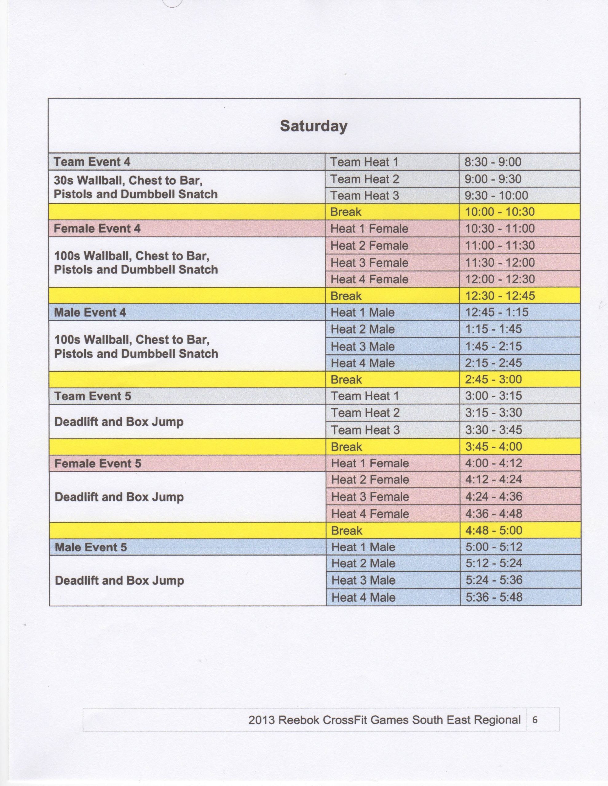 Below is also the Heat Schedule for the Regional.  Coach Drew will start in Heat 4 for the Men.  Take note of the times, but we will be posting to the website, Facebook and Twitter through out the weekend.