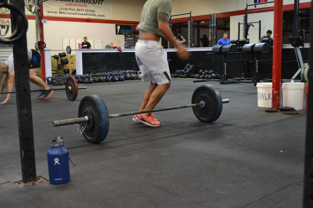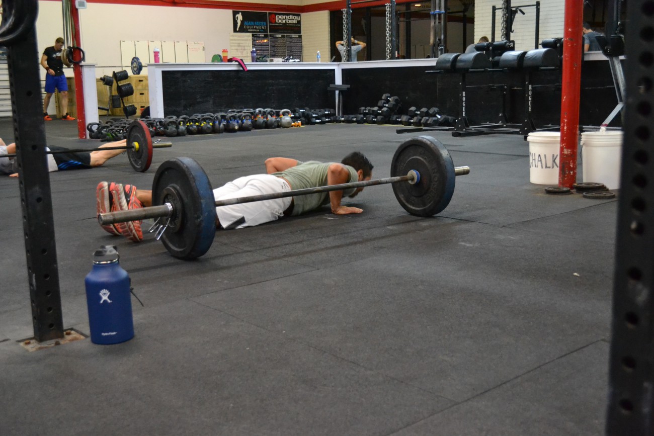 3 X: 100m Row 5 Squats 5 Sit ups 5 Push ups :30 Bar hang